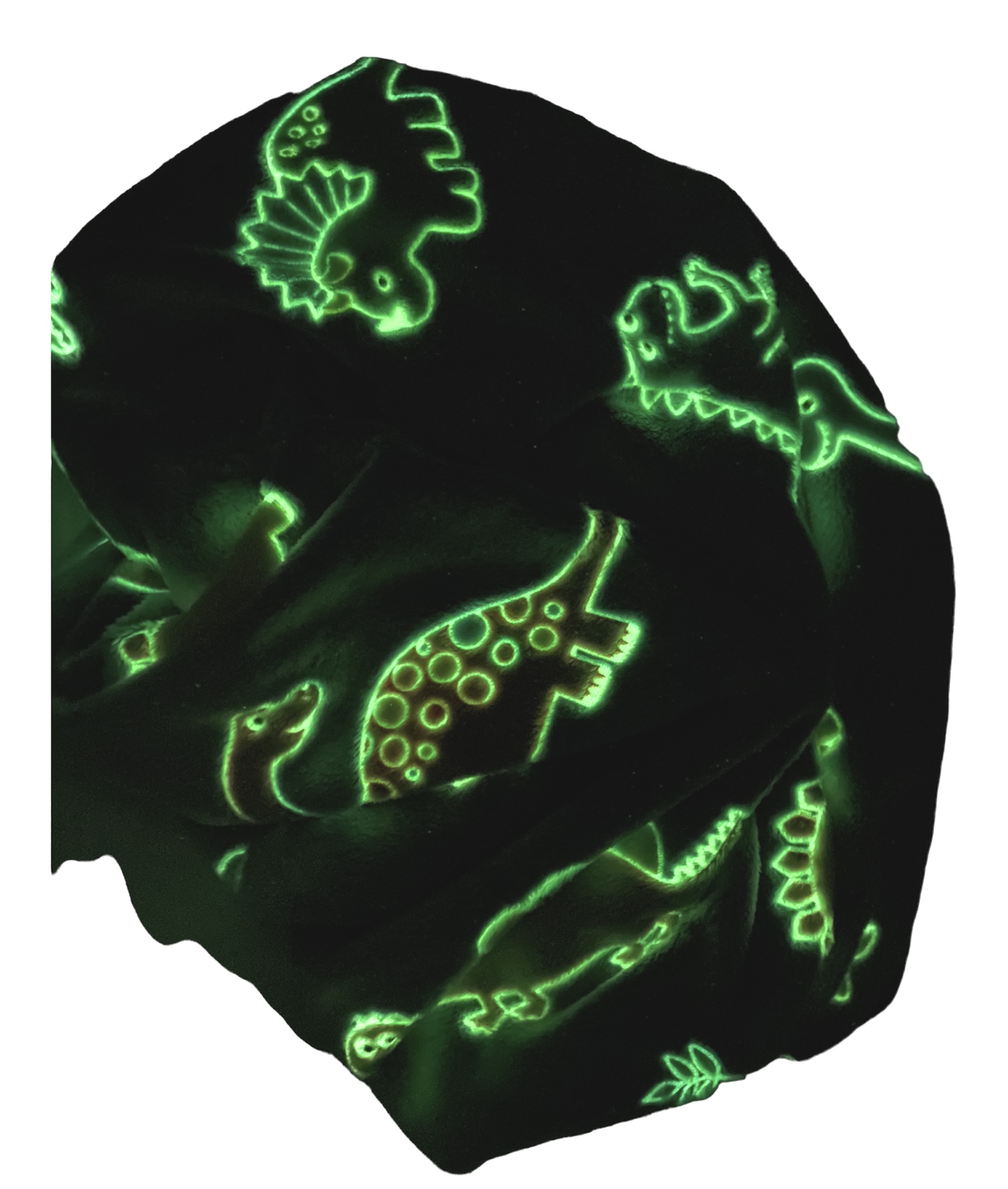 Dzianina wykonana całkowicie z poliestru z nadrukowanymi wzorami dinozaurów po prawej stronie. Dinozaury posiadają powłokę fluorescencyjną, która daje efekt świecenia w ciemności (widoczny na zdjęciu). Po lewej stronie kocyk jest gładki pluszowy i również bardzo przyjemny w dotyku.