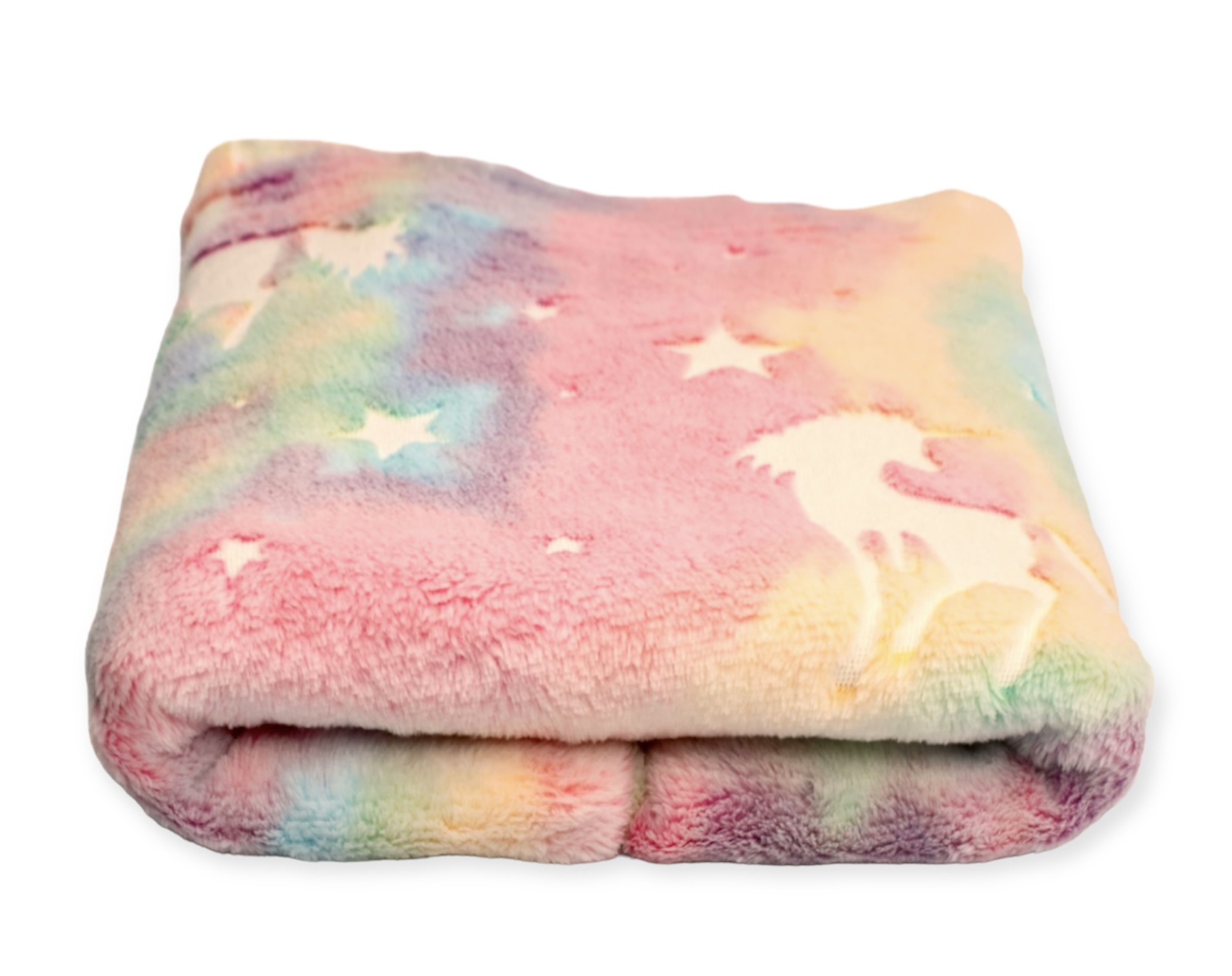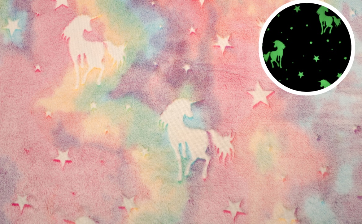 Kocyk pluszowy wzór Jednorożec multikolor świecący w ciemności 150x200 cm