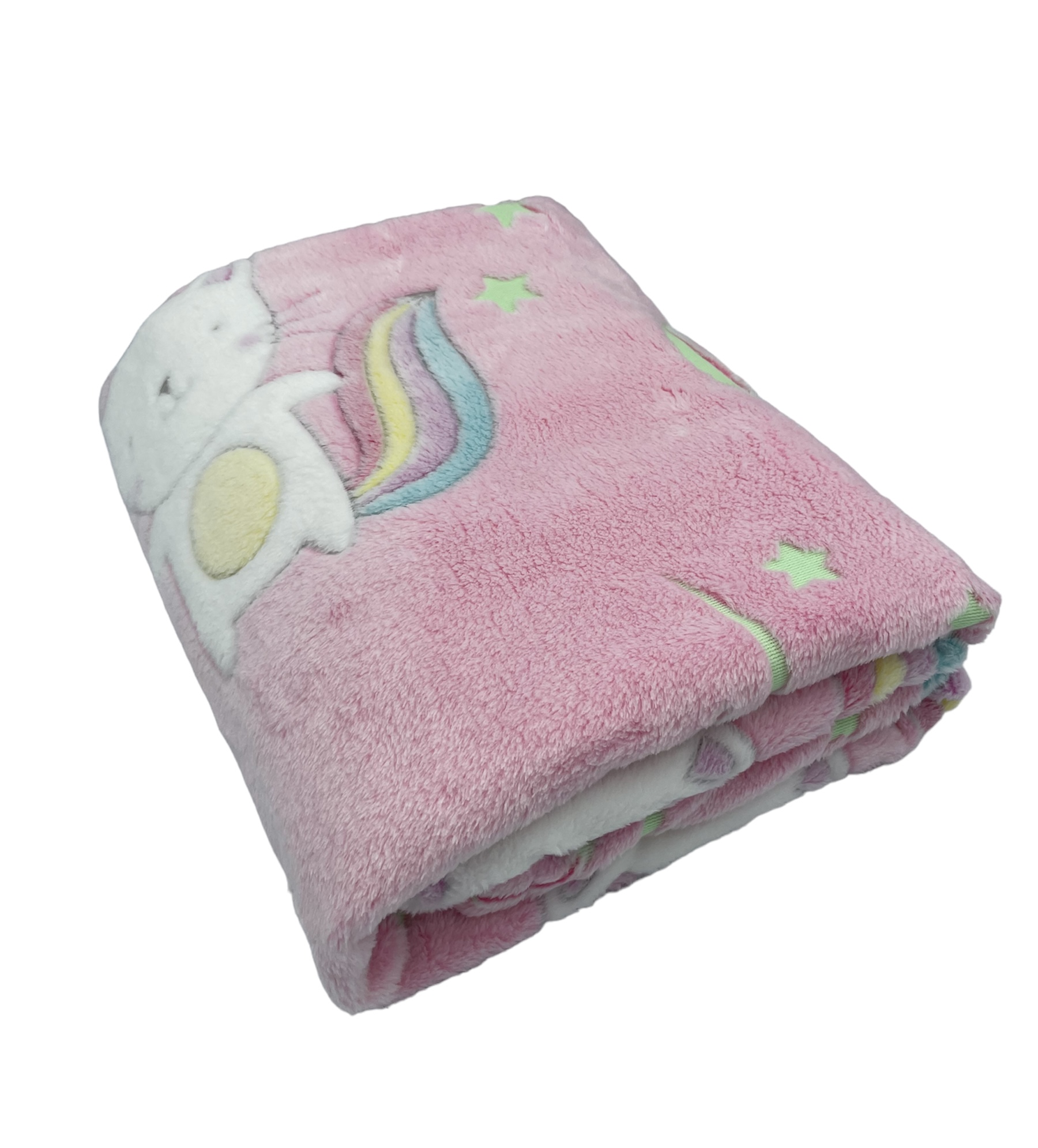 Poduszka i kocyk posiadają niektóre wzory z powłoką fluorescencyjną co sprawia, że wieczorem po zgaszeniu światła elementy świecą.