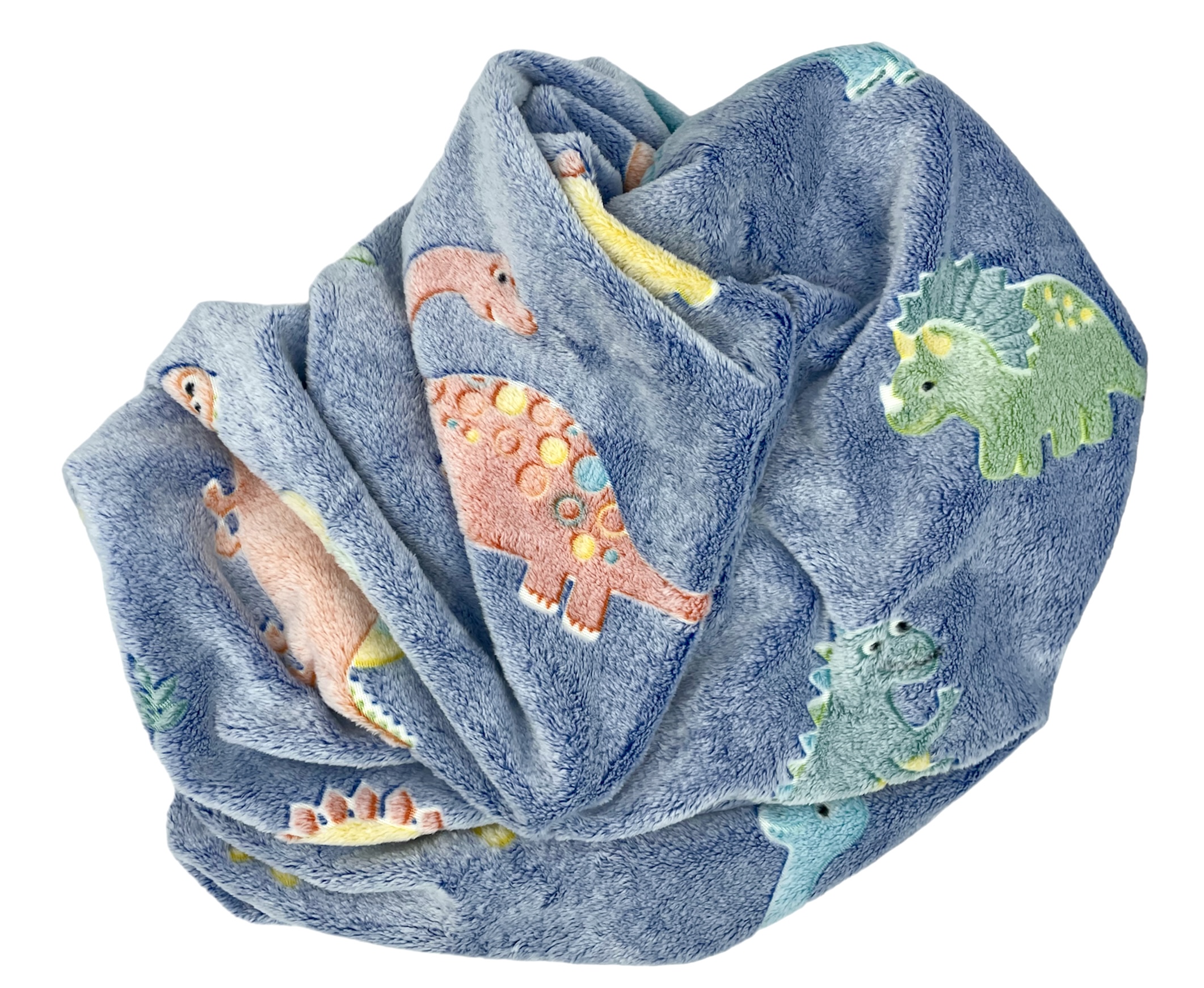 Dzianina wykonana całkowicie z poliestru z nadrukowanymi wzorami dinozaurów po prawej stronie. Dinozaury posiadają powłokę fluorescencyjną, która daje efekt świecenia w ciemności (widoczny na zdjęciu). Po lewej stronie kocyk jest gładki pluszowy i również bardzo przyjemny w dotyku.