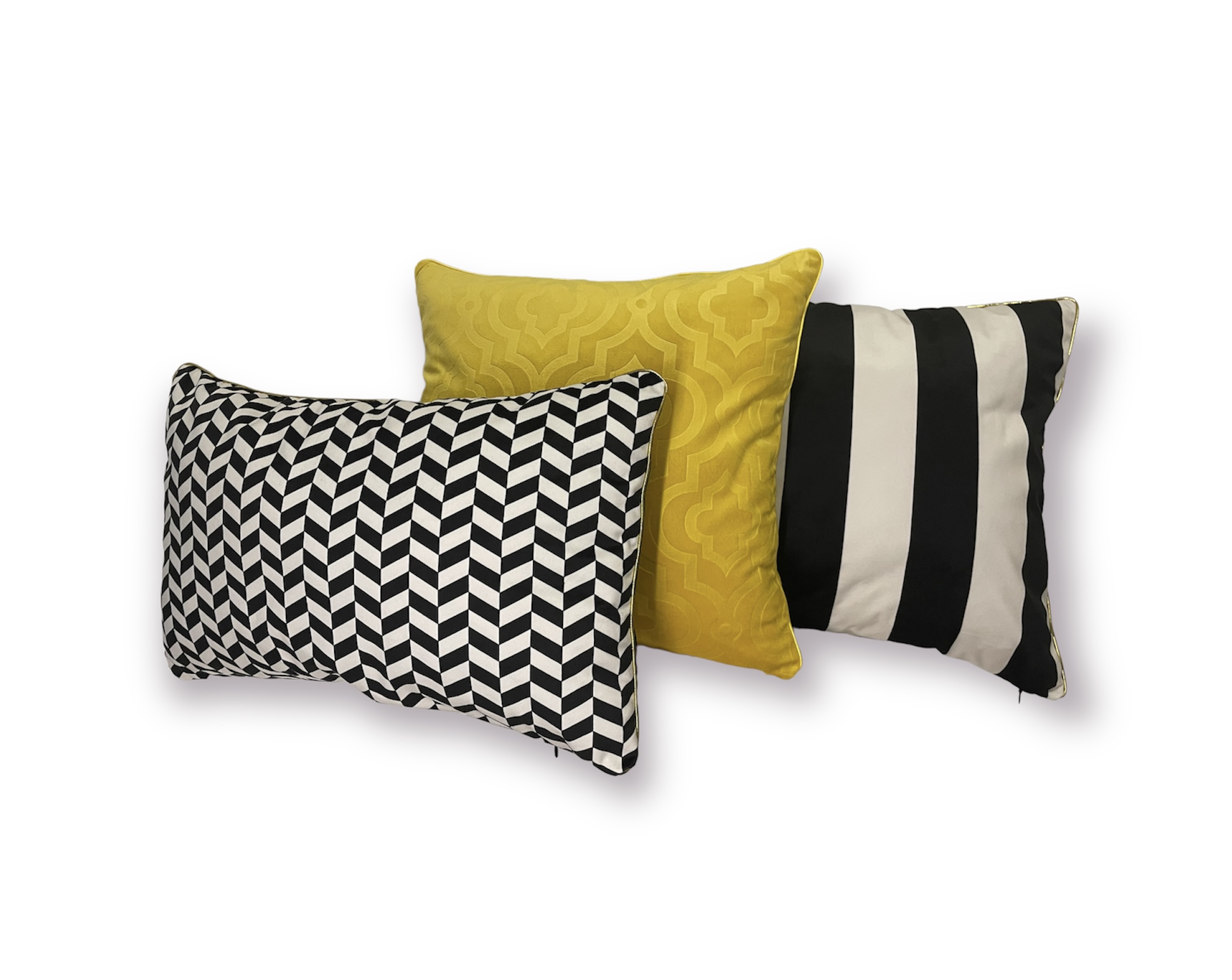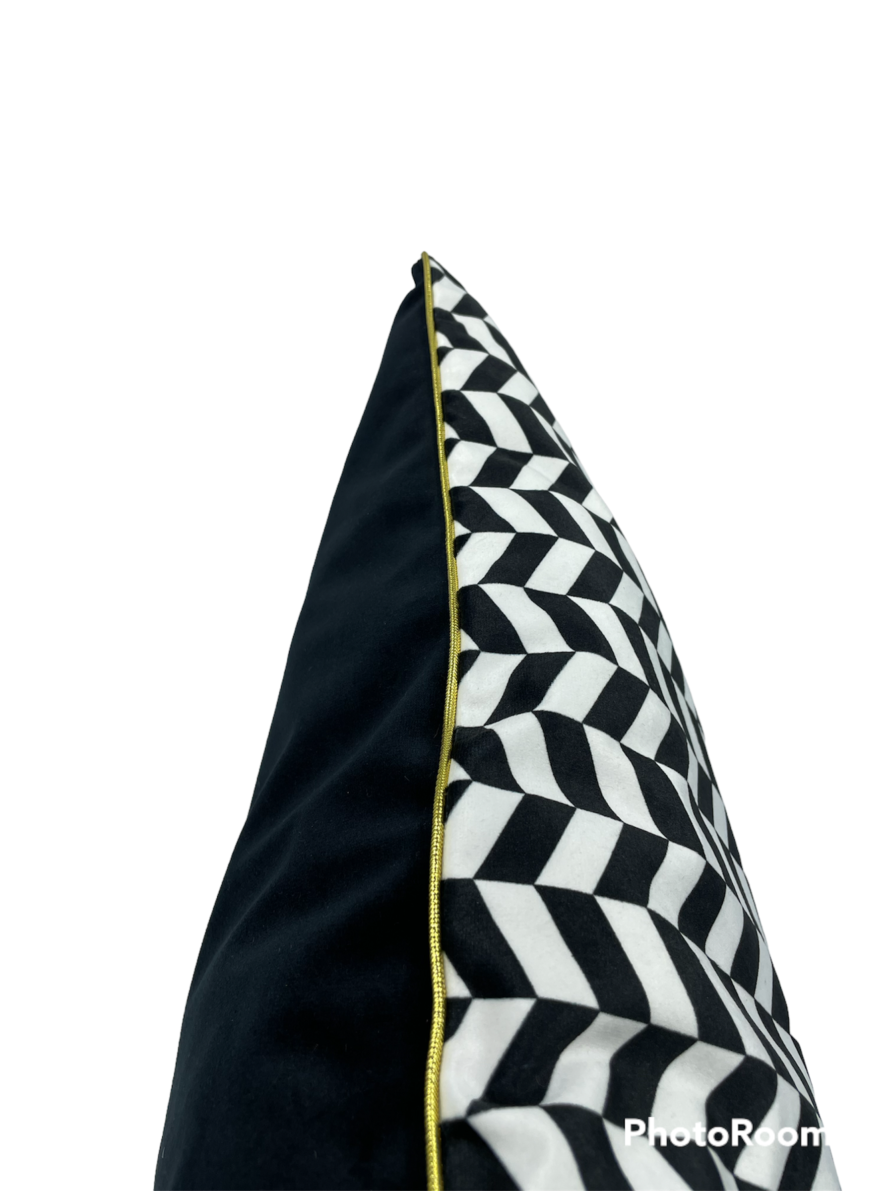 Z jednej strony poduszka uszyta jest z velvetu drukowanego w małe czarno-białe zygzakowate paseczki, a z drugiej z gładkiego czarnego velvetu. Dodatkowo na zszyciach z trzech stron ozdobiona jest cienką złotą pięknie połyskują lamówką.